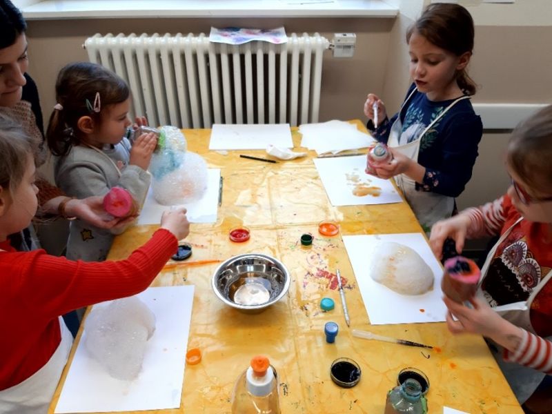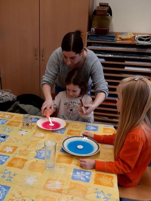 So konnten die ‚kleinen Forscher‘ mit bunten Zuckerwürfeln Wasser färben, Papierseerosen zum Blühen bringen, bunten Schaum pusten, beobachten, wie ein Teelicht in einem Glas aufsteigt und man Wasser entsalzen kann. Alle ‚kleinen Forscher‘ waren mit Neugierde und Freude dabei und bekamen an jeder Station einen Stempel in ihren Forscherpass.